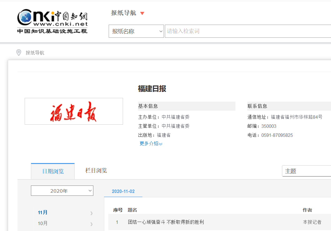 福建日报请添加:知网收录。具体见截图,本报知网网址:https://navi.cnki.net/knavi/NPaperDetail?pcode=CCND&bzpym=FJRB
