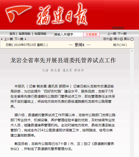 福建日报2019年7月23日中第四版要问4《龙岩全省率先开展县道委托管养试点工作》一文,据我所知,泉州市安溪县在去年(2018年)已经把全县道路统一委托养护了。