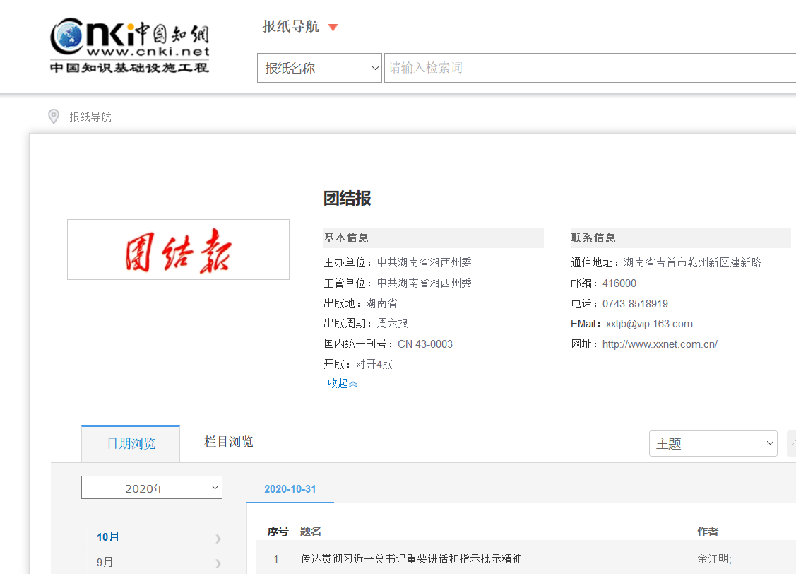 请添加湖南的《团结报》。北京的《团结报》万维书刊网已经收录,但存在同名报纸,湖南的《团结报》。主办单位:中共湖南省湘西州委,出版周期:周六报,国内统一刊号:CN 43-0003,通信地址:湖南省吉首市乾州新区建新路,EMail:xxtjb@vip.163.com,官方网址:http://www.xxnet.com.cn/。知网收录,见截图,知网网址:https://navi.cnki.net/knavi/NPaperDetail?pcode=CCND&bzpym=TUJE