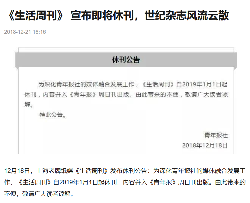 请标注:《生活周刊》停刊,自2019年1月1日起休刊,内容并入《青年报》周日刊出版。网站:https://www.sohu.com/a/283502115_99953831