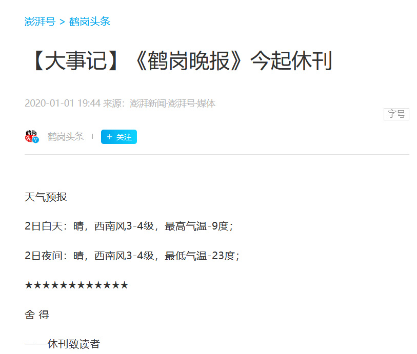 请标注:停刊。《鹤岗晚报》2020-01-01休刊,澎湃新闻有报道,见截图,网址:https://www.thepaper.cn/newsDetail_forward_5412164