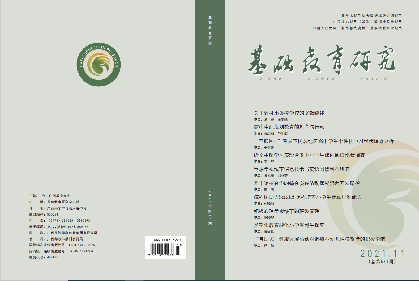 《基础教育研究》(半月刊,100页)每册定价9.00元,国内公开发行,国内刊号:CN45-1094/G4,国际刊号:ISSN1002-3275。