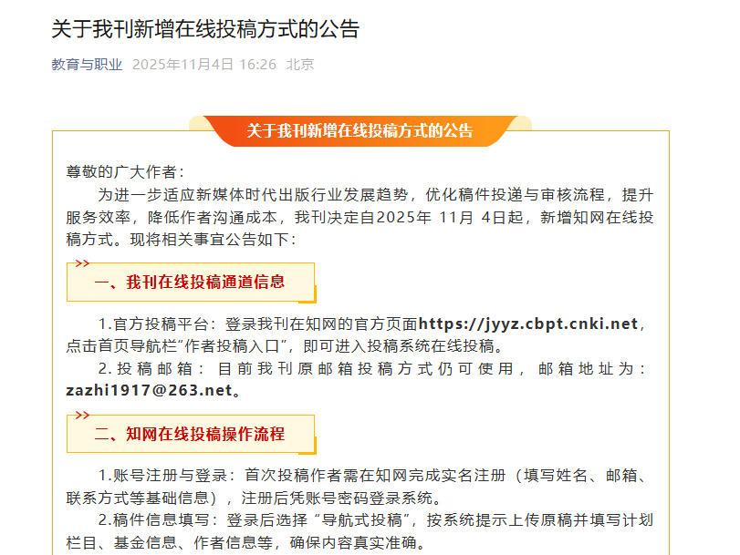尊敬的广大作者:为进一步适应新媒体时代出版行业发展趋势,优化稿件投递与审核流程,提升服务效率,降低作者沟通成本,我刊决定自2025年 11月 4日起,新增知网在线投稿方式。现将相关事宜公告如下:
