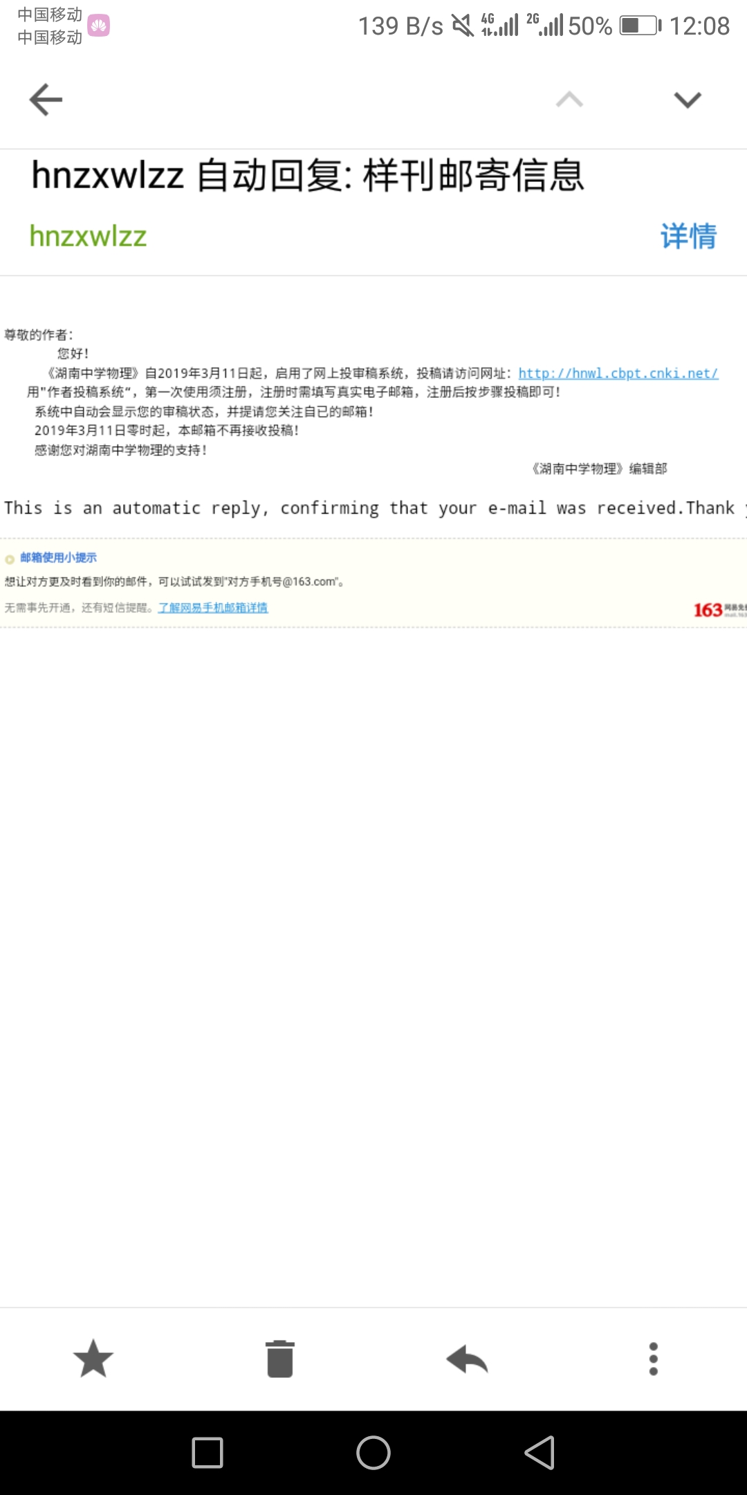 湖南中学物理的投稿邮箱从2019年3月11日改为http://hnwl.cbpt.cnki.net/