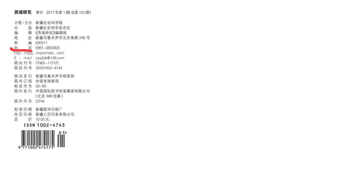 十二、稿件请寄至: 新疆乌鲁木齐市北京南路 246 号新疆社会科学院 《西域研究》编辑部,邮政编码: 830011,电子信箱: xyyjbjb@126. com,电话: 0991—3837937。