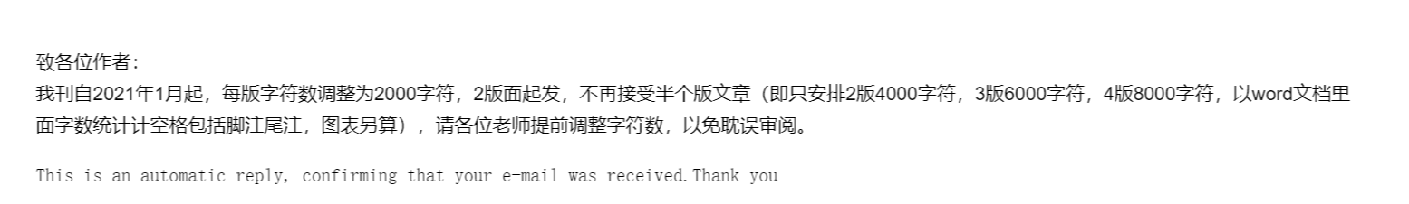 我刊自2021年1月起,每版字符数调整为2000字符,2版面起发,不再接受半个版文章(即只安排2版4000字符,3版6000字符,4版8000字符,以word文档里面字数统计计空格包括脚注尾注,图表另算),请各位老师提前调整字符数,以免耽误审阅。】