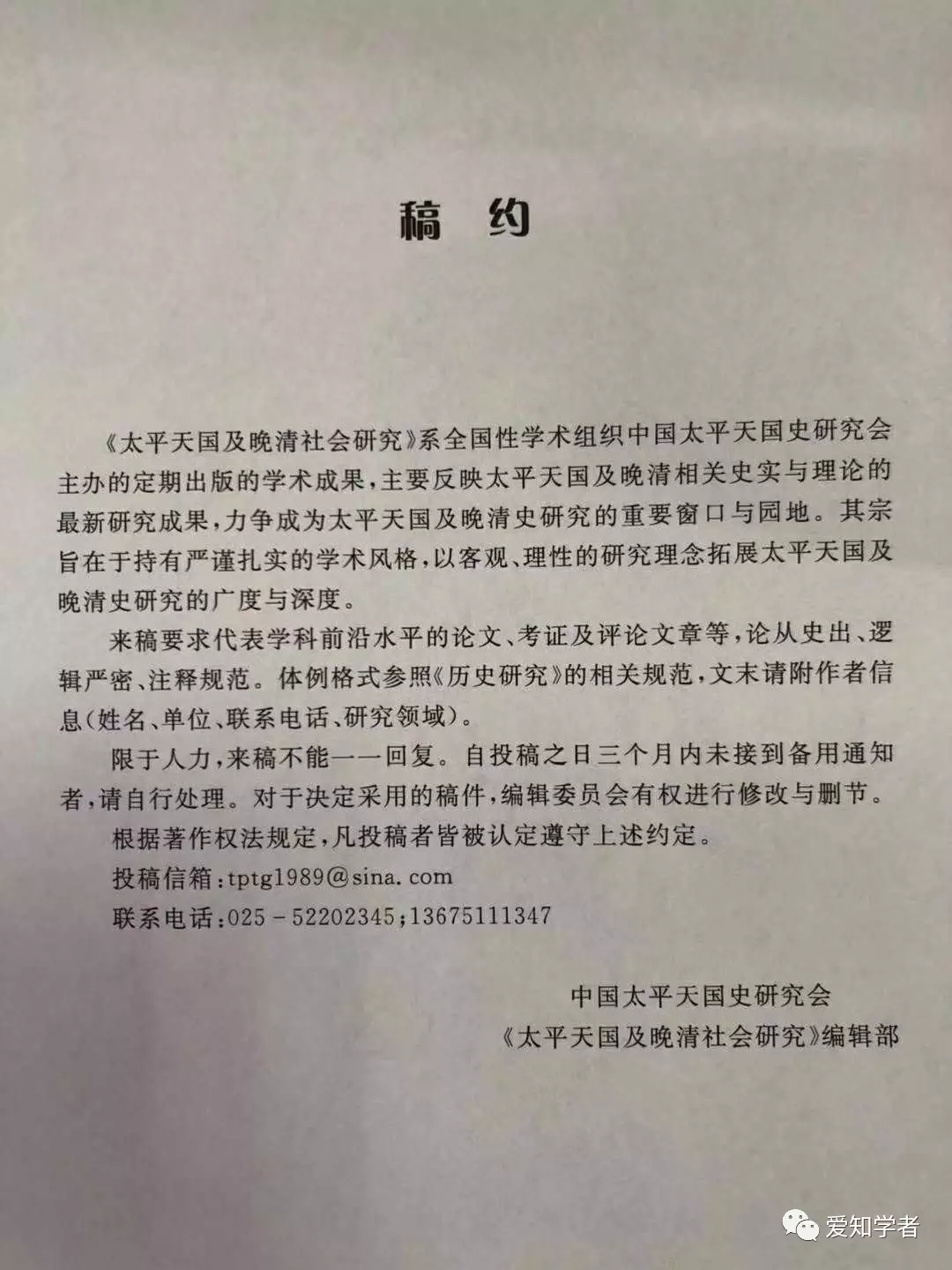 管理员回复:谢谢您提供信息,但因该刊主办单位“中国太平天国史研究会”从工商登记上查,只有“统一社会信用代码”和注册资本及法人,其他如地址、联系方式、网址、电话、经营范围、资质有效期等,都查不到,集刊的连续出版及官方正规征稿信息也查不到,因此,暂不做收录,待以后信息全面了再说吧,再次谢谢!