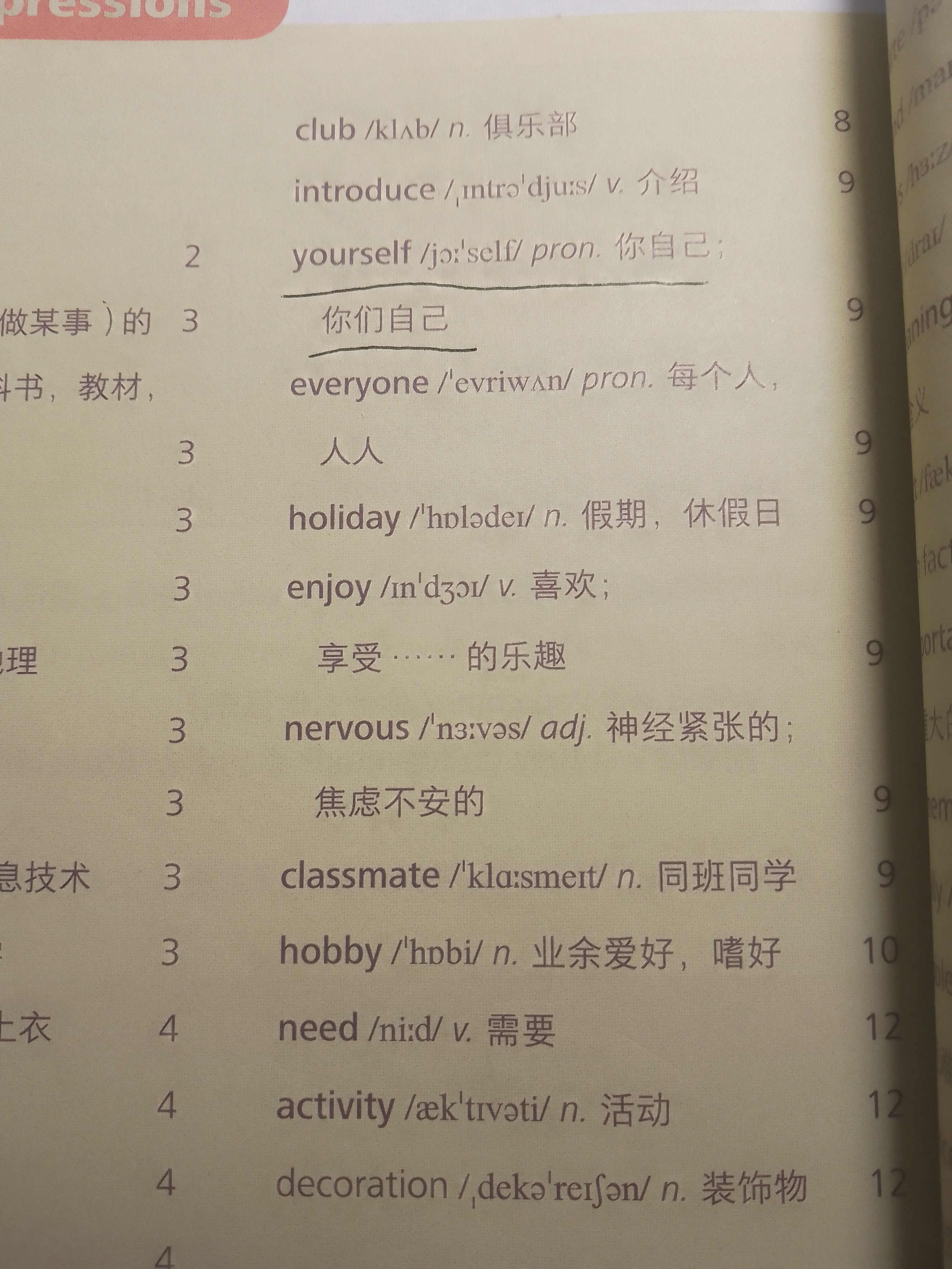 2024年新标准外研版七年级上册英语书150页starter单词,Yourself你自己,你们自己。