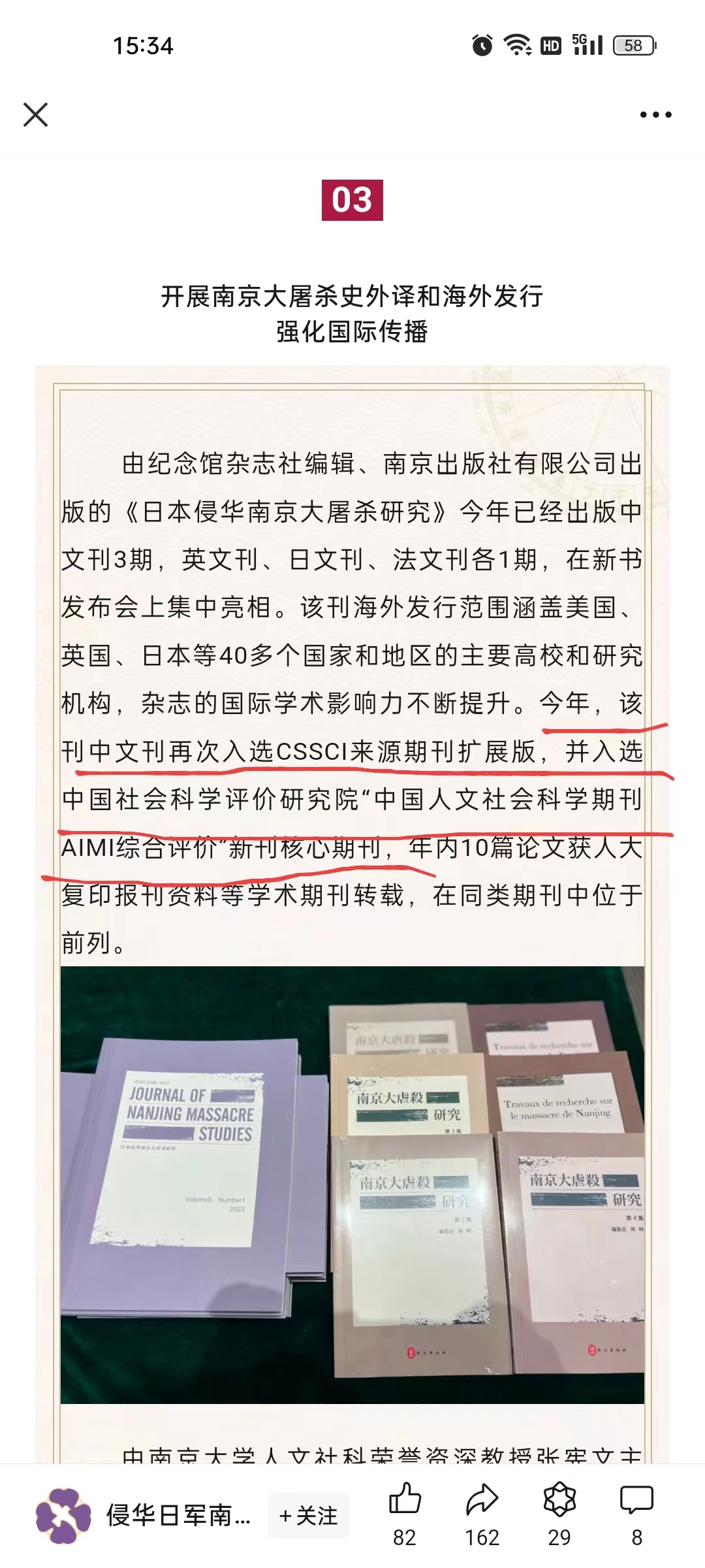 你好,上回留言说《日本侵华南京大屠杀研究》这本杂志去年再次入选C扩了,这个信息在2023年12月6日的“侵华日军南京大屠杀遇难同胞纪念馆”官方微信公众号提到的,文章题目是“一批反映南京大屠杀历史主题新书今首发”,里面有一段“这本刊物今年再次入选C扩”。我附截图如下。所以这本杂志是2023-2024CSSCI扩展板来源刊。