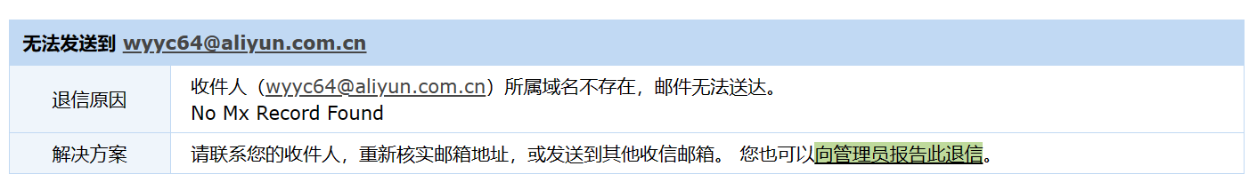 收件人(wyyc64@aliyun.com.cn)所属域名不存在,邮件无法送达。