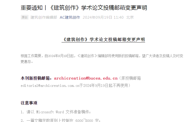 《建筑创作》编辑部2024年9月19日 来源:建筑创作编辑部 AC建筑创作公众号:重要通知丨《建筑创作》学术论文投稿邮箱变更声明