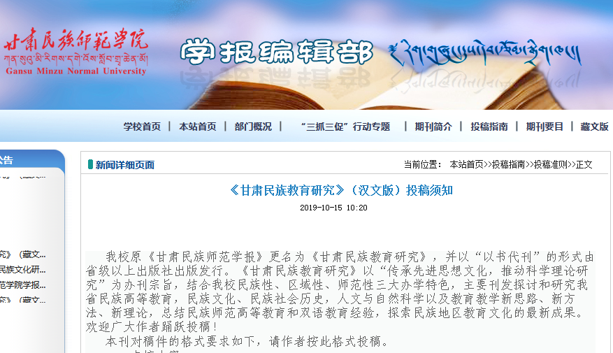 请补充刊物《甘肃民族教育研究》(以书代刊),由甘肃民族师范学院编辑出版。原名《甘肃民族师范学报》,2019年10月起改为现名。无刊号,以书代刊出版,投稿邮箱:gmyxbbjb@163.com。官网:http://xbbjb.gnun.edu.cn/info/2136/1058.htm