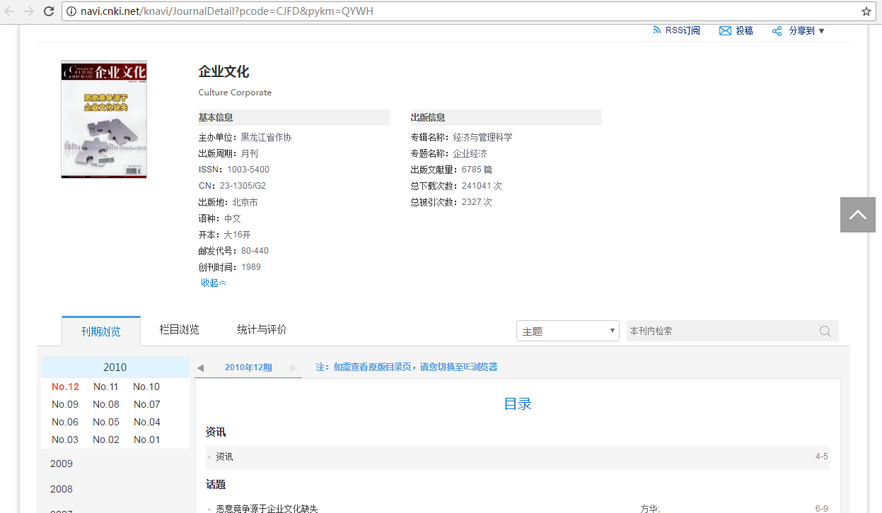 《企业文化》刊物在知网上可以查到刊物信息,但文章只能查到1994—2010年,2011年及其以后的文章,知网并没有收录。但万方上是可以查到文章的,并且为旬刊。