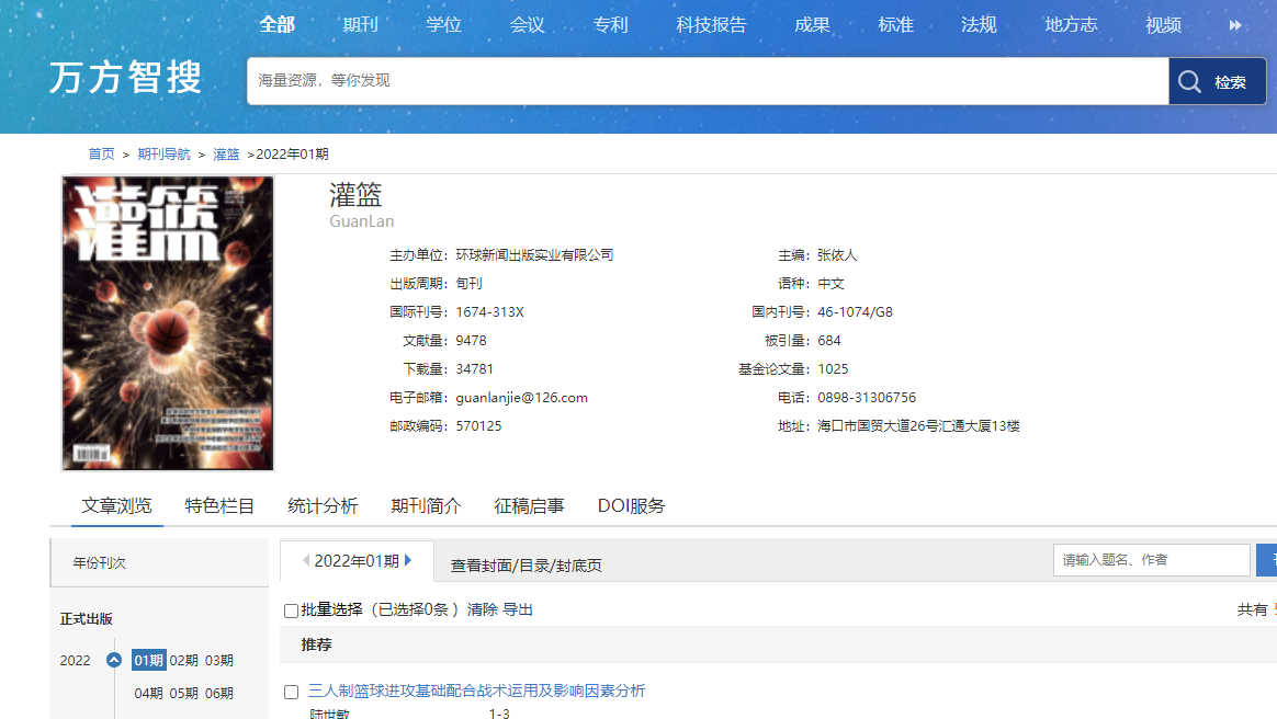 请收录《灌篮》,万方已更新22年刊期,可收论文,来源:https://sns.wanfangdata.com.cn/sns/perio/guanl?tabId=article