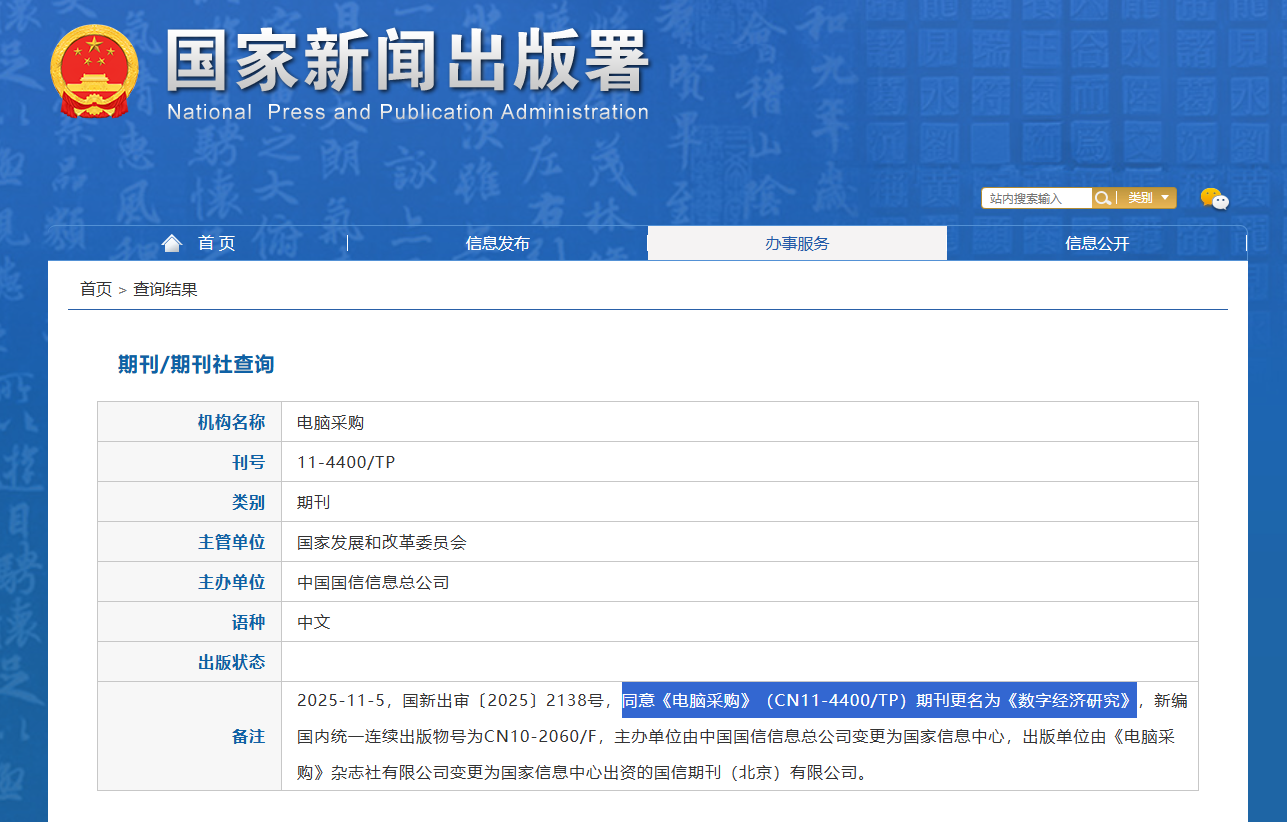 《电脑采购》期刊更名为《数字经济研究》;主办单位由中国国信信息总公司变更为国家信息中心。