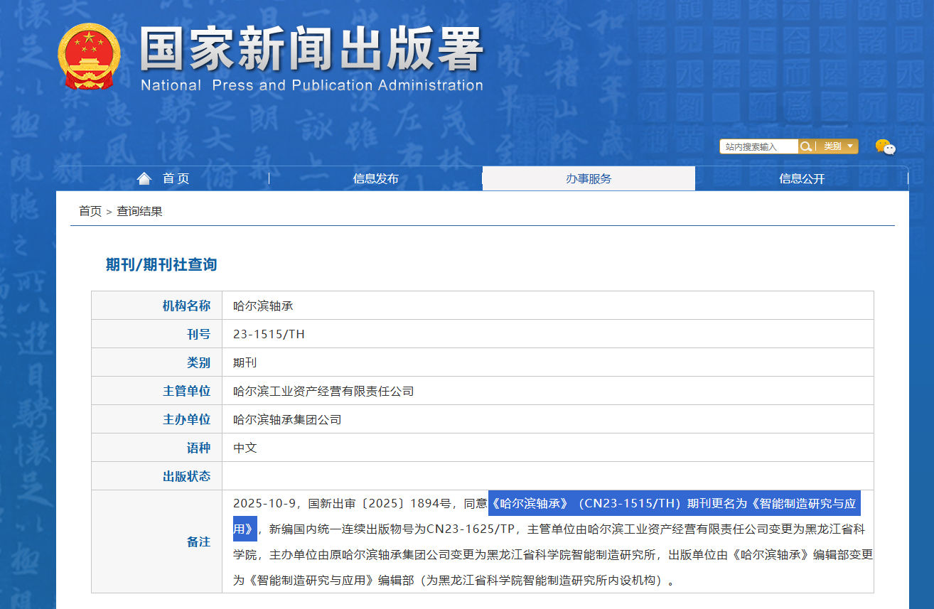 《哈尔滨轴承》更名为《智能制造研究与应用》