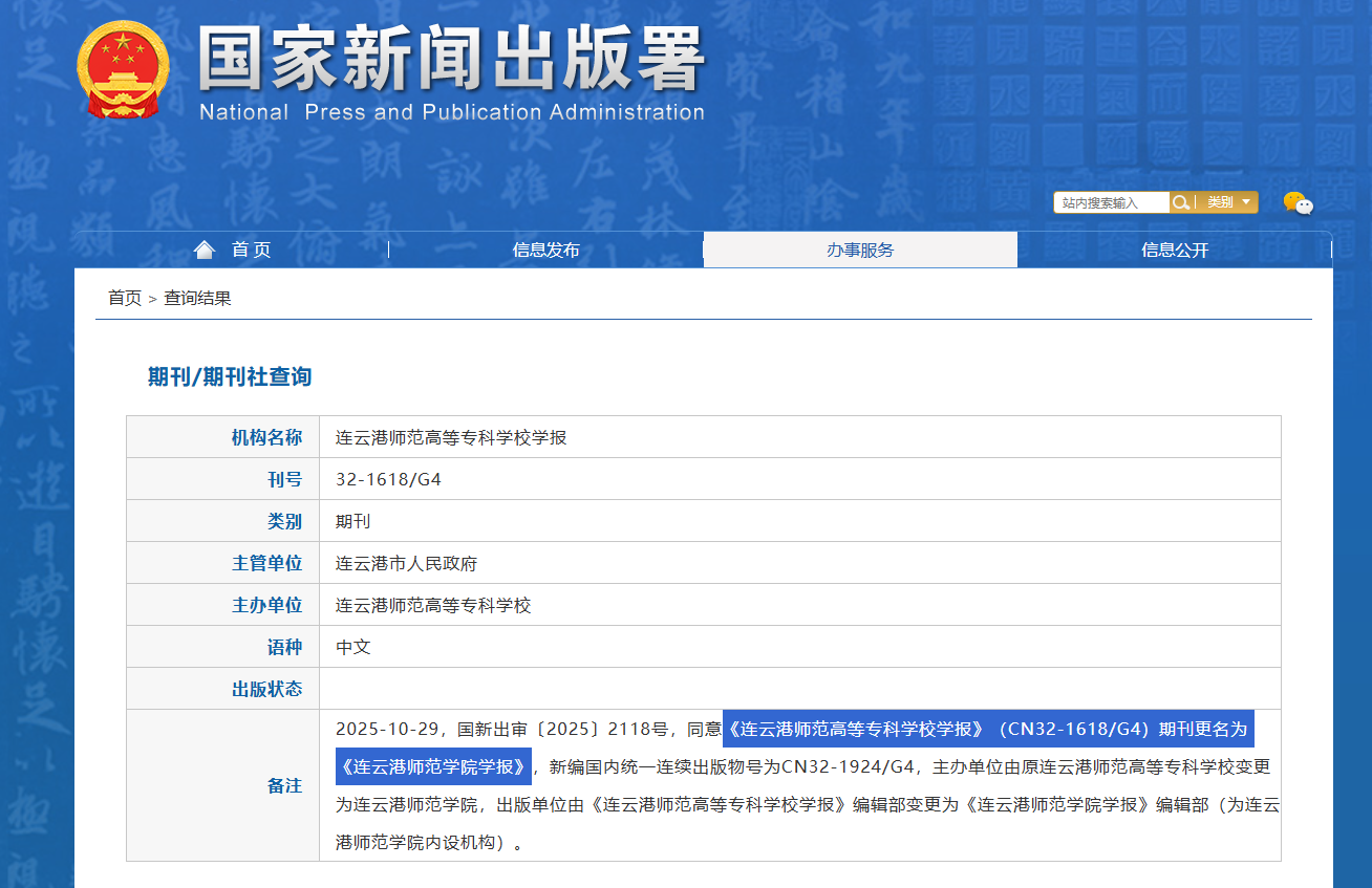 《连云港师范高等专科学校学报》期刊更名为《连云港师范学院学报》