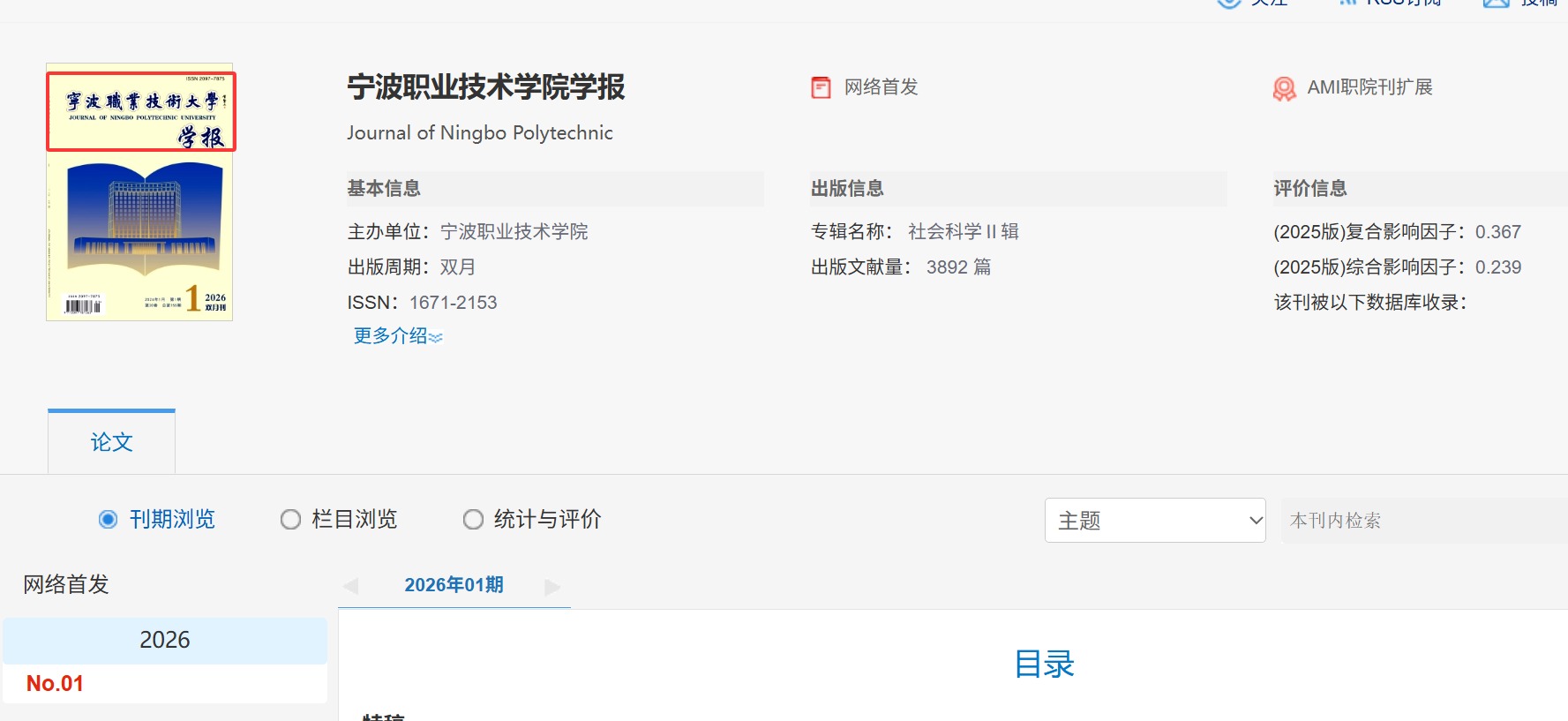 本刊是浙江省教育厅主管、宁波职业技术学院主办的学术性刊物,双月刊,不出增刊。国内统一刊号是33-1263/Z,国际统一刊号是1671-2153,每逢双月25日出版发行。 本刊已加入知网、万方等10多个数据库,不同意文章上网者,请申请撤稿。由于办刊经费紧张,本刊不付稿酬,不同意者请申请撤稿。