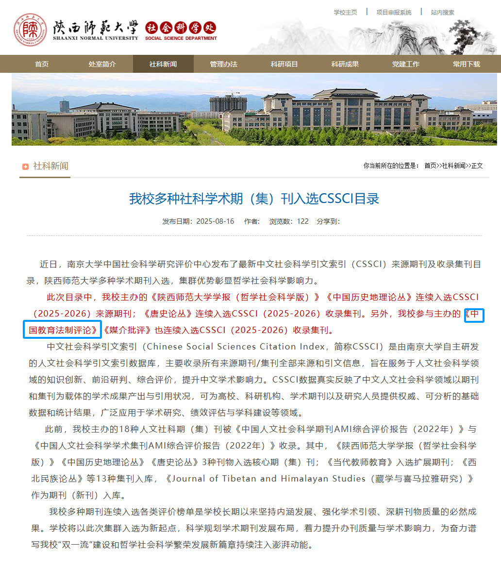 《中国教育法制评论》入选CSSCI来源集刊(2025-2026)