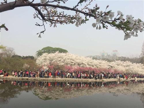 朔风罢,正暖阳。玉渊潭桃樱芬芳,湖水岸家人摄景忙。都撮在春游图上!
