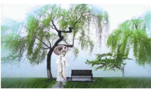 湖岸绿柳长椅,夏日和风细雨。娘子油伞素衣。小径独立,不见许仙哪里!